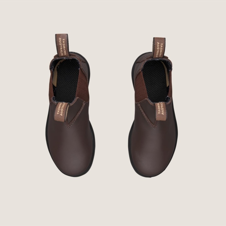 - جزء علوي من الجلد البني الفاخر وحذاء تشيلسي مطاطي بني.