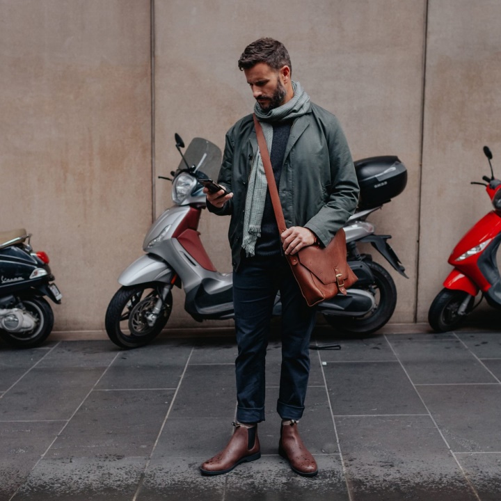 - جزء علوي من الجلد الفاخر باللون البني الكستنائي وحذاء تشيلسي مرن أسود.